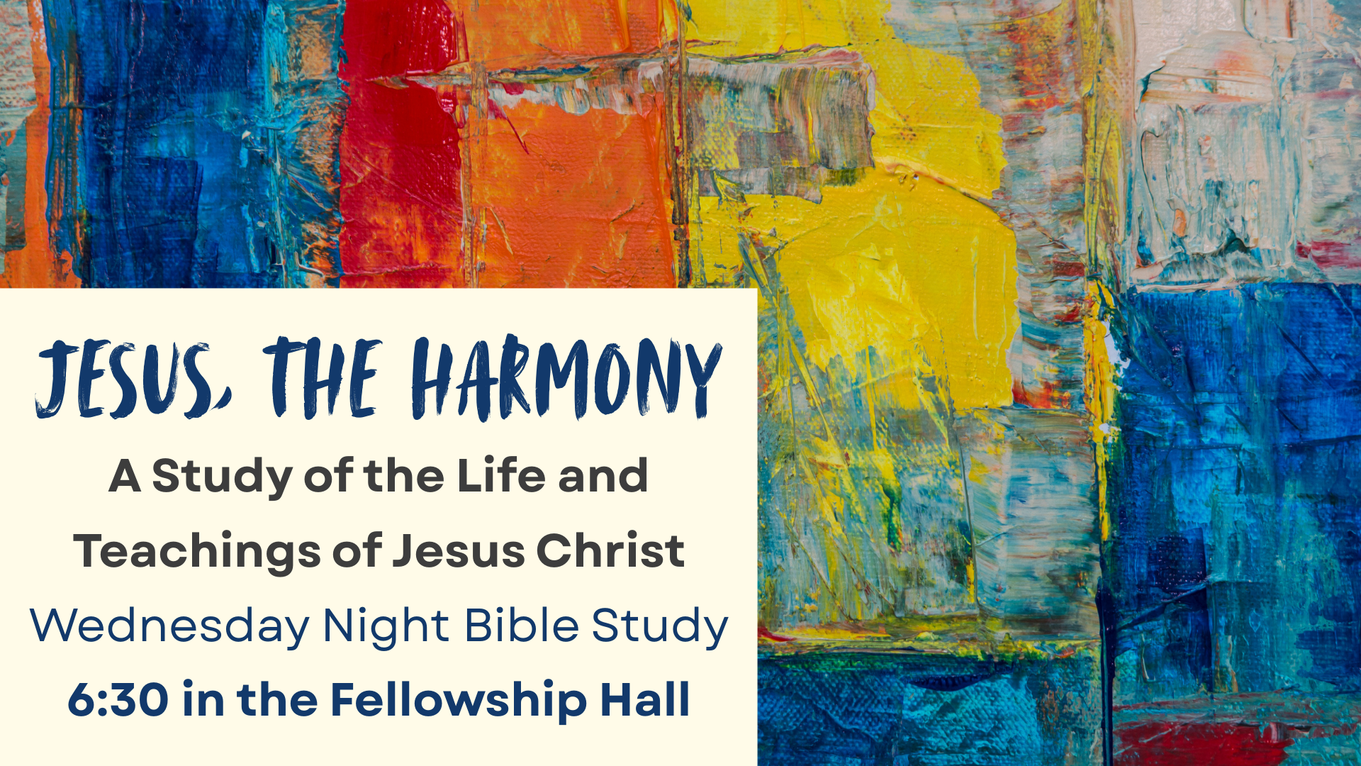 Our Wednesday Night Bible Study, led by Pastor Jeff, meets in the Fellowship Hall at 6:30 p.m. The current study is Jesus, The Harmony: a unique chronological, harmonized account of Jesus’ life written in a simplified flow.